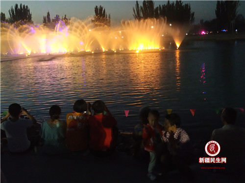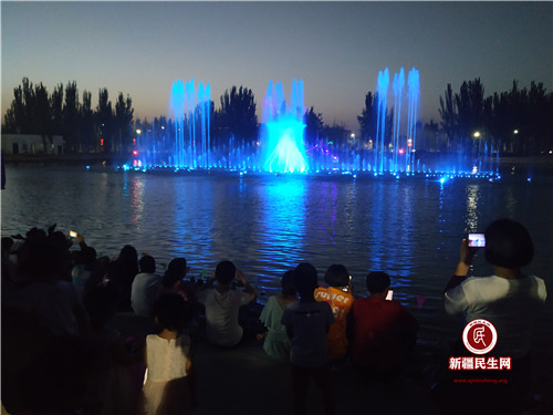 (刘玉萍)沙雅县路政局驻沙雅镇景旁社区访惠聚工作队组织各族居民群众欢聚音乐喷泉处,感受不一样的炎热夏季。